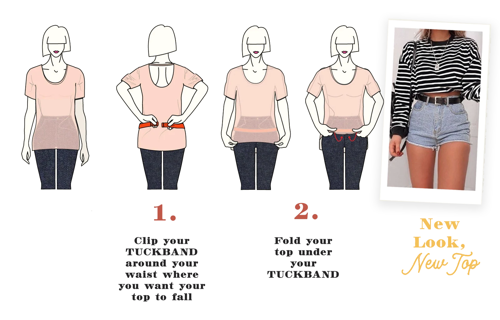 - Turn any top into a crop - No need to cut your tops - No need to tuck your tops into your bra - Tuckband your top.
